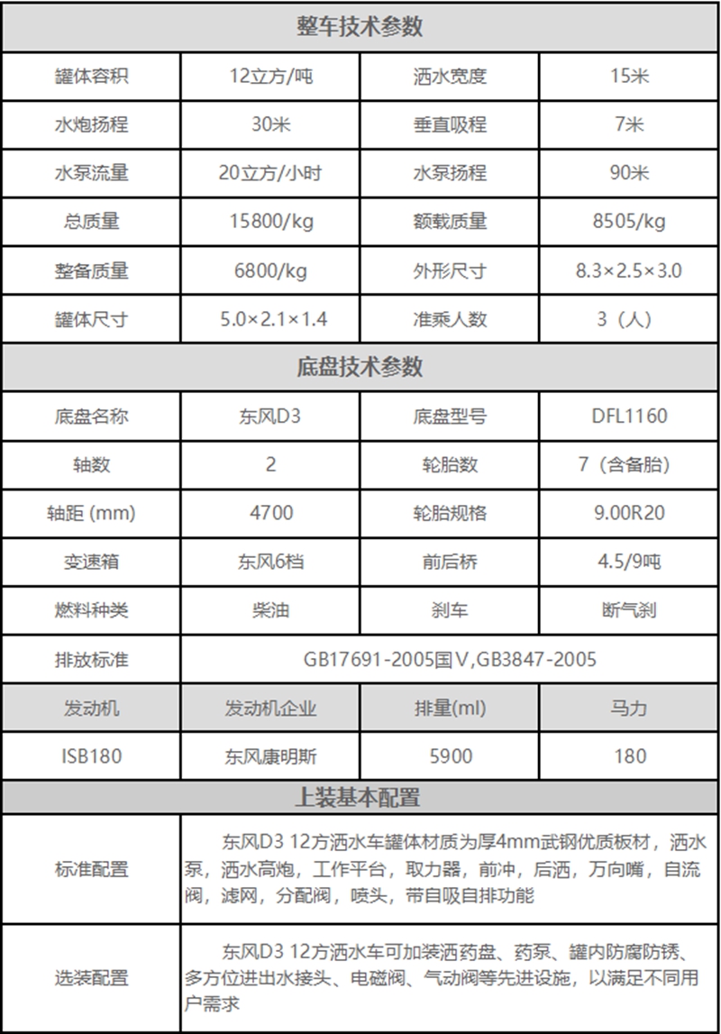 東風D3 12方灑水車上裝配置: