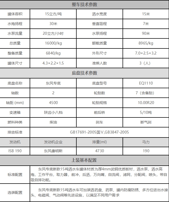 東風專底新款15噸灑水車采用東風153新款專用底盤,白色排半可前翻駕駛室,康明斯190馬力國五發動機,陜齒小八檔變速箱,軸距4500mm,東風德納前橋5噸,后橋10噸,10.00R20原廠鋼絲胎,原廠abs,電動玻璃,中控鎖,帶方向助力,離合助力器,斷氣剎制動。