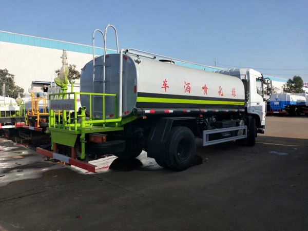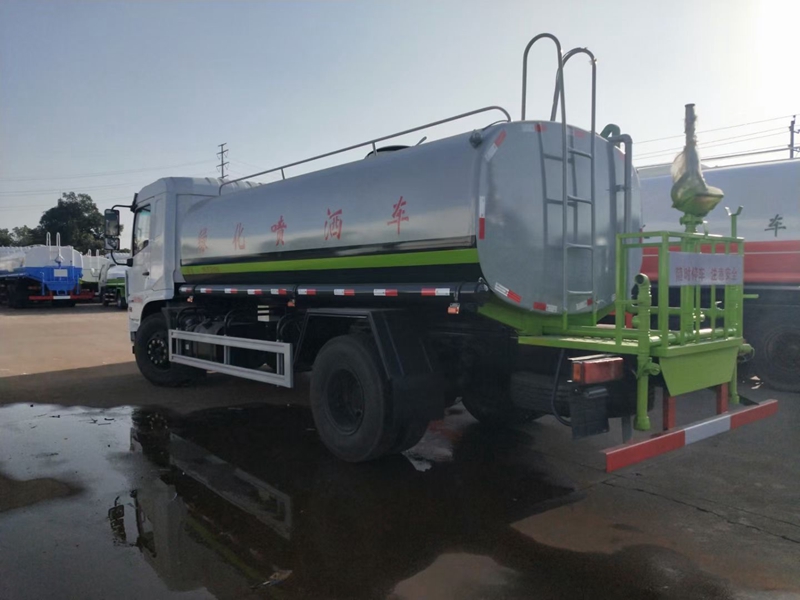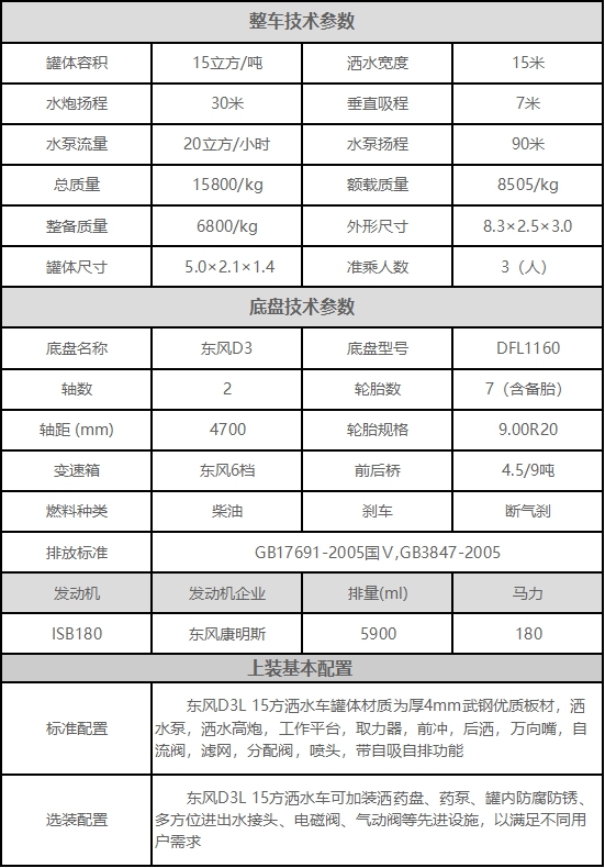 上裝:容積15立方,罐體采用標準Q235碳鋼制作,板材厚度4mm,配大功率專用灑水車,可自吸自排,前沖后灑,側(cè)噴,高位花灑,主管道加粗,直通球閥式消防接口,帶后工作平臺,沖孔平臺,帶高炮。