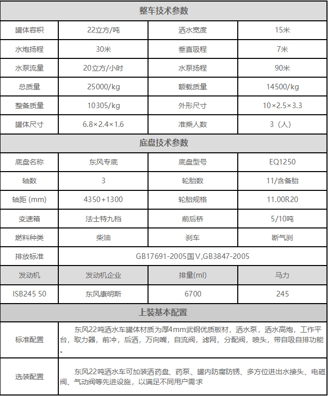 東風(fēng)22噸灑水車上裝配置: