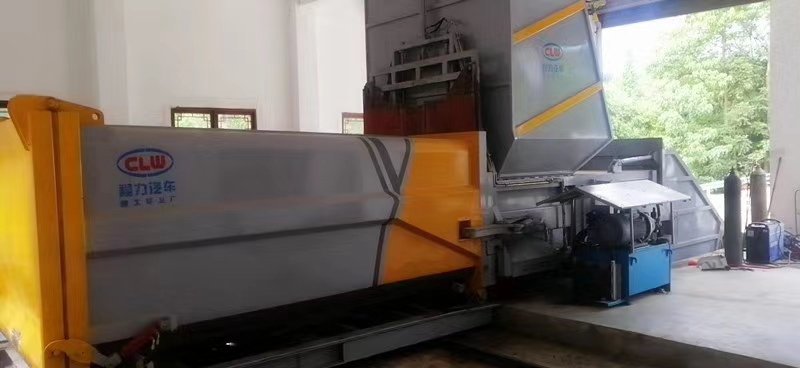 主機(jī)箱體包含:主機(jī)箱體、壓縮倉(cāng)、壓頭、壓縮油缸、滑輪、液壓系統(tǒng)、電控系統(tǒng)等組成。其主要結(jié)構(gòu)件采用Q345高強(qiáng)度結(jié)構(gòu)鋼焊接成成,具有較有的耐磨性;主機(jī)箱體上的滑輪與滑臺(tái)導(dǎo)軌配合,使主機(jī)能相對(duì)滑臺(tái)滑動(dòng),液壓電控系統(tǒng)固定安裝于主機(jī)箱體上,整體簡(jiǎn)潔美觀。箱體容積18m3,匹配20噸后雙橋車廂可卸式垃圾車。
