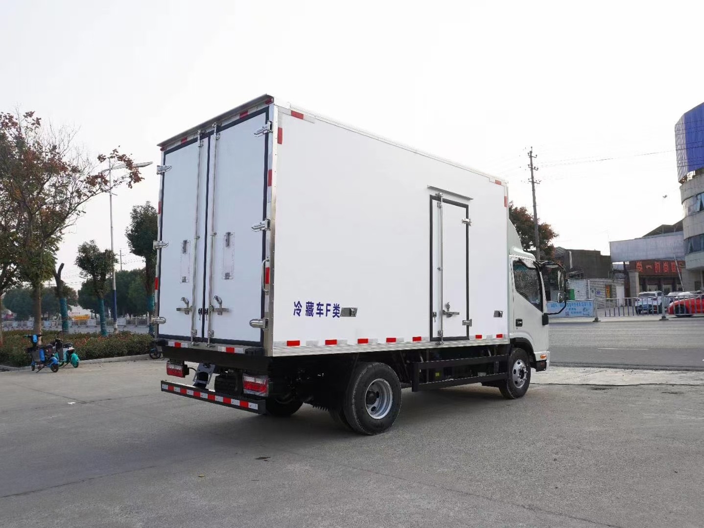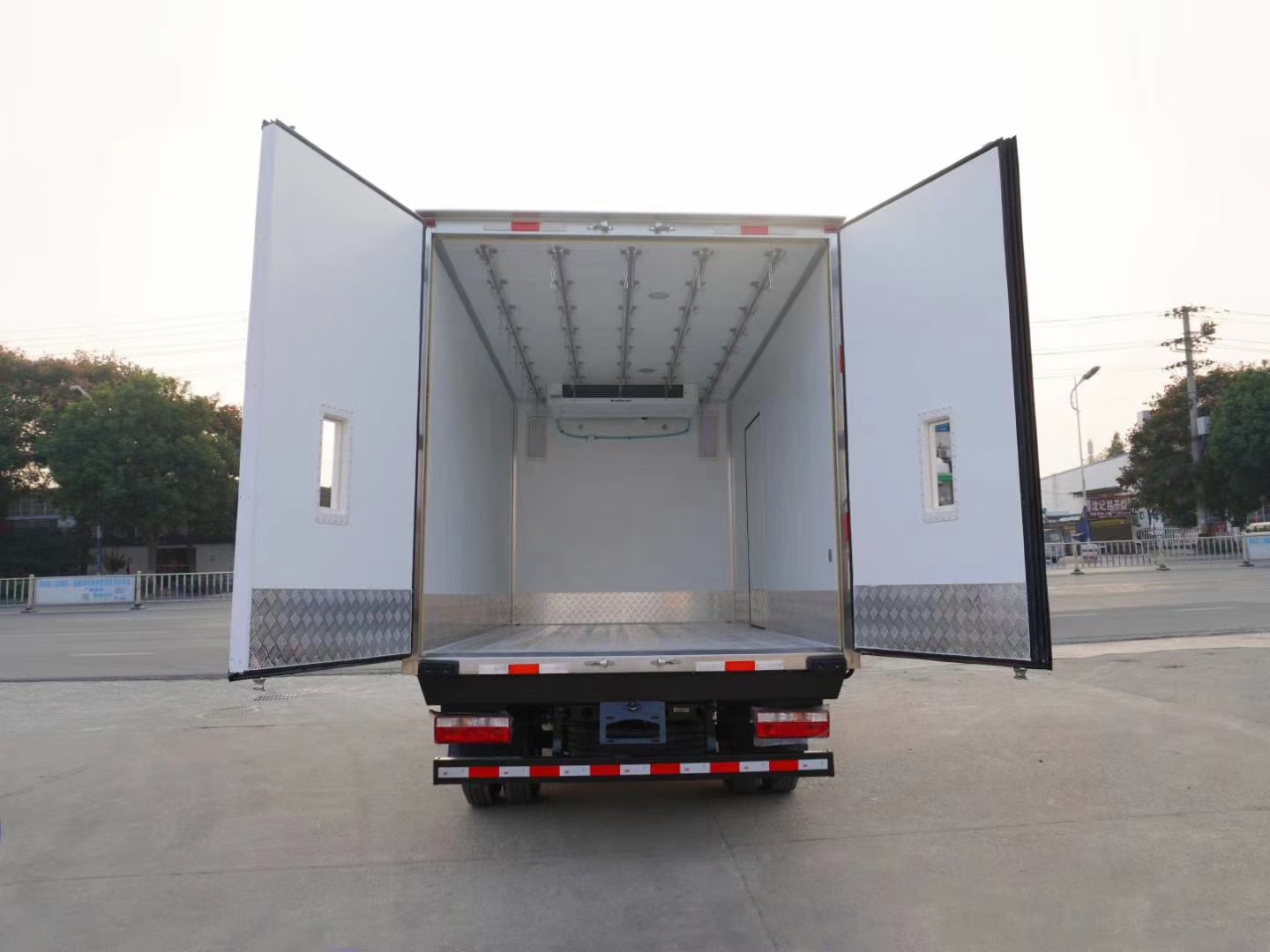 廂體工藝: 廂體材質(zhì)采用內(nèi)外玻璃鋼,中間8CM聚氨酯保溫板,后雙開門,廂體右側(cè)靠前選裝開側(cè)門,底部采用花紋防滑鋁板,前部排水孔,門邊條采用迷宮式橡膠密封條,鋁合金型材包邊,不銹鋼包角,不銹鋼門鎖,不銹鋼門框及合頁(yè),廂體內(nèi)節(jié)能LED照明燈。